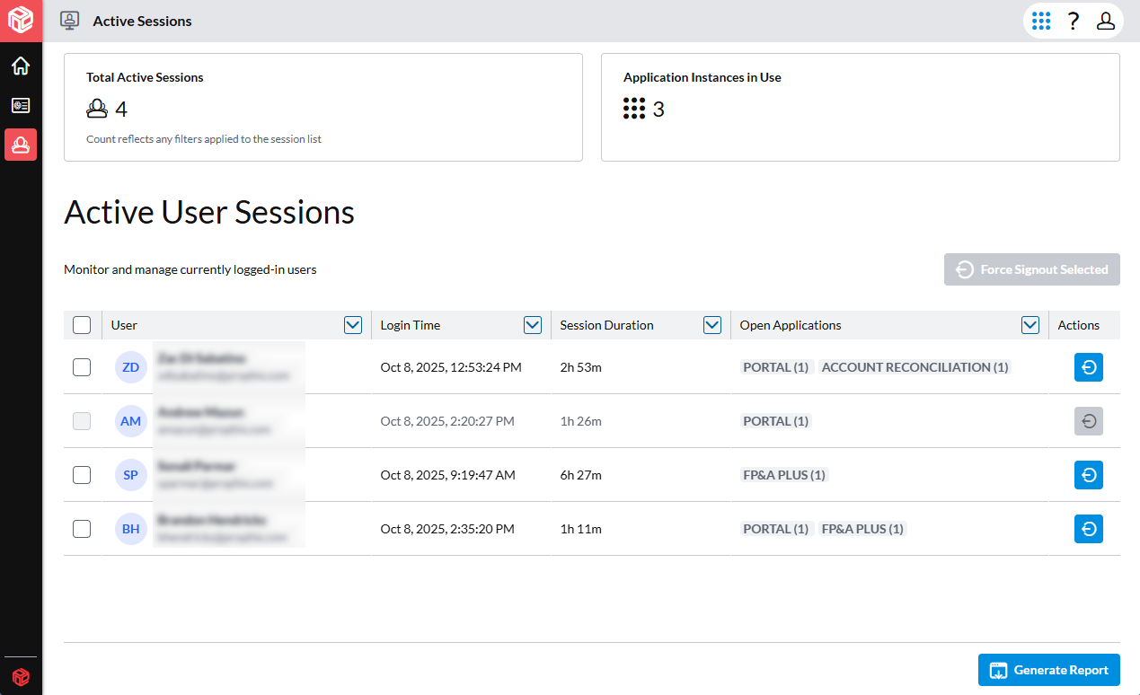 New! Admins use Active User Sessions to monitor and manage currently signed-in users across all Prophix One applications. If required, an admin can end a session by forcing a signout.