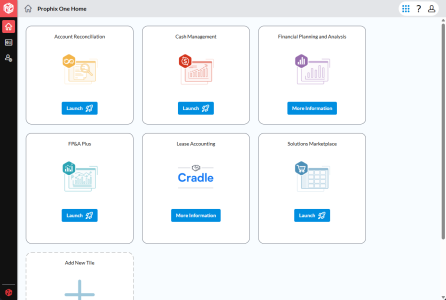 After successfully signing in, you see Prophix One Home. The main area shows the Prophix One applications that you have permission to use and, for information purposes, any applications that your organization has not licensed for you. The example below shows four licensed apps (Launch ) and two apps you can learn about (More Information).